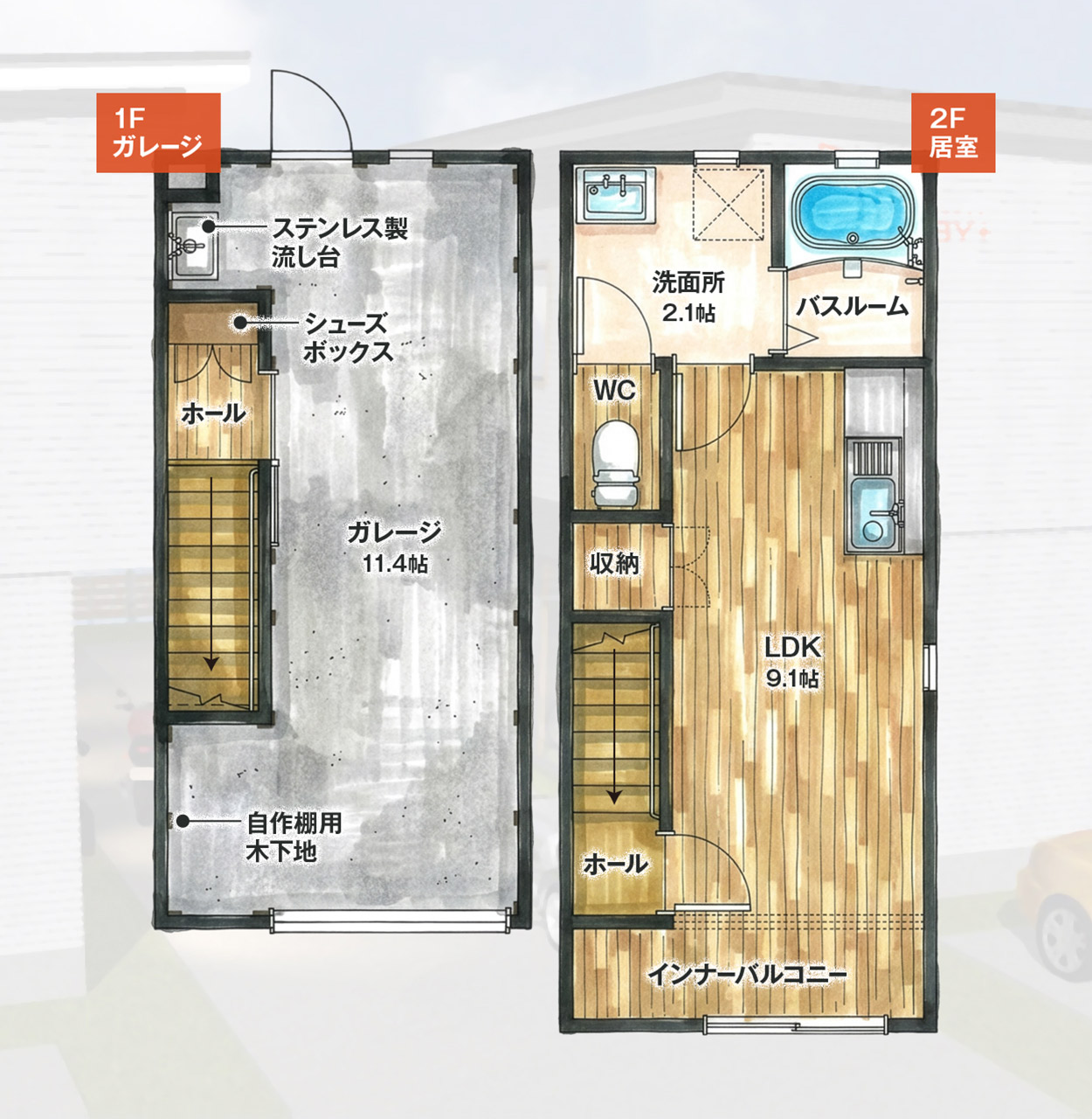 | 間取り | 1階:ガレージ/2階:単身居住用 |